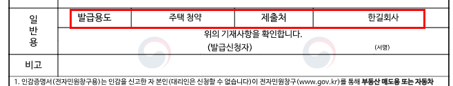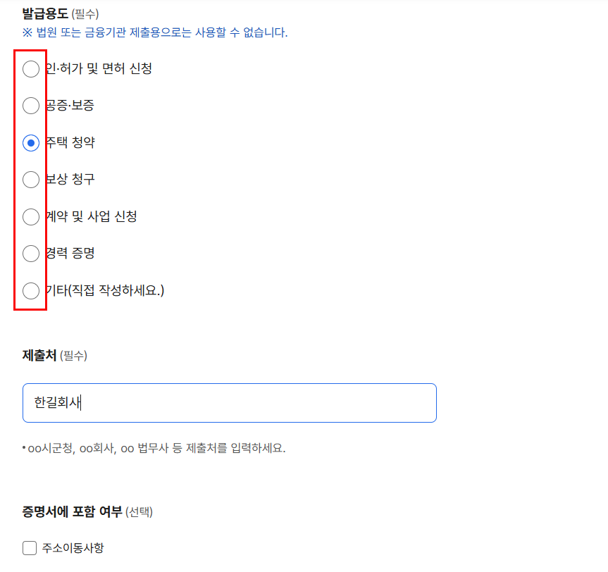 발급 용도를 체크해줍니다.