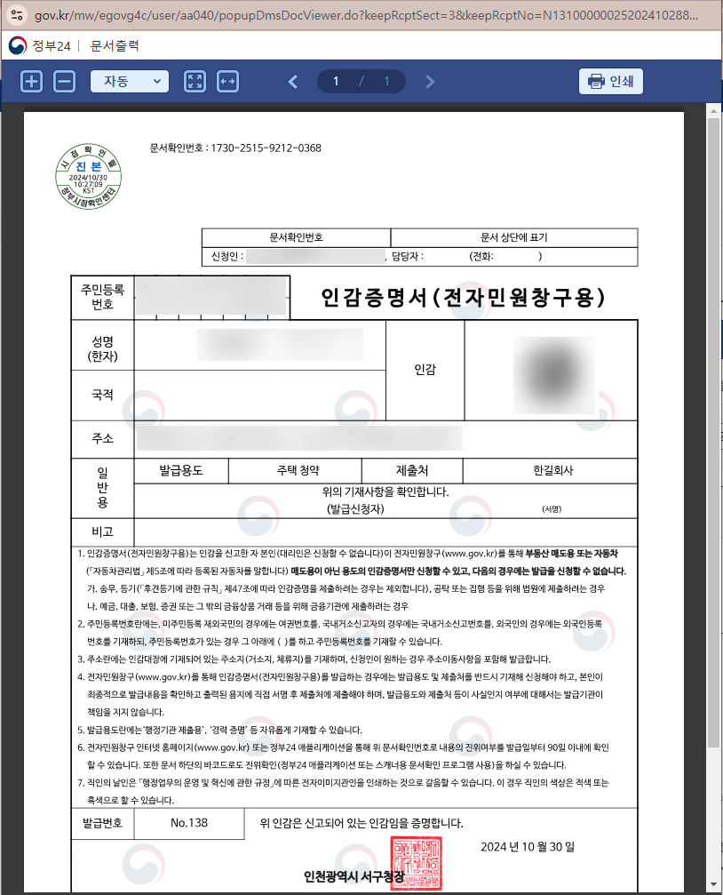 신청한 인감증명서 출력하는
